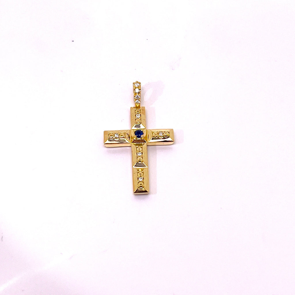 CROCE IN ORO 18KT, ORO GIALLO CON DIAMANTI E ZAFFIRO CENTRALE